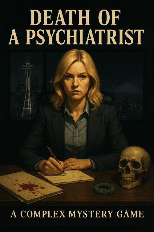 Death of a Psychiatrist is a premium seven-part murder mystery game built for serious players. With 25–50 hours of gameplay, this experience goes far beyond the typical mystery box.