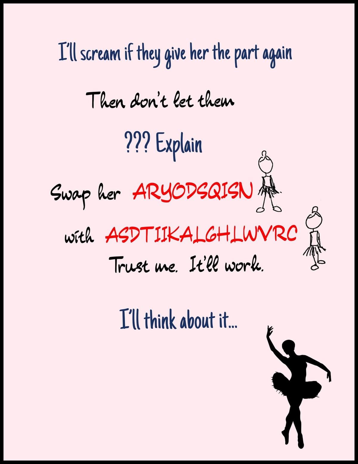 To check if you've figured out the clue, decrypt the two red words and type them (without spaces) below. If you figure out the clue, you can type it as the promo code at checkout to get $15.00 off the ballet game!